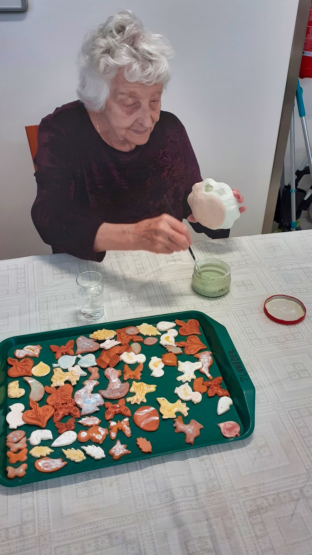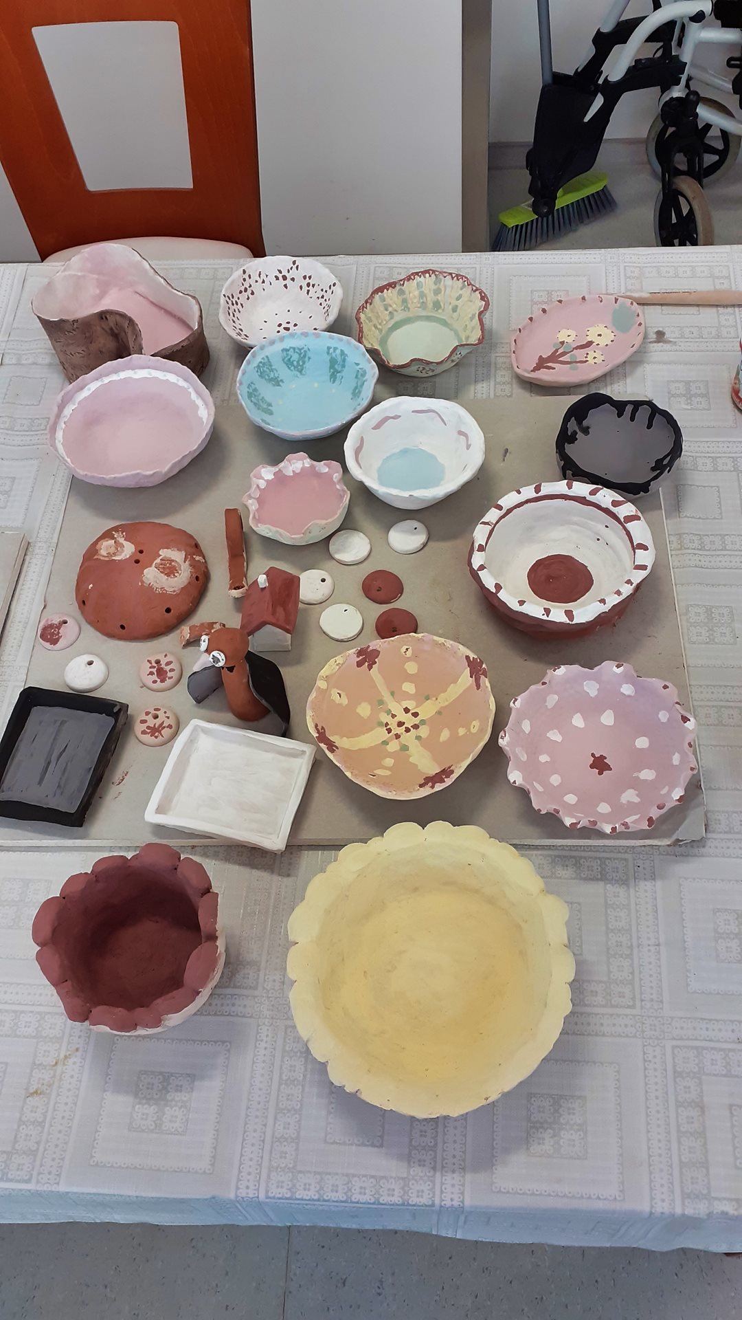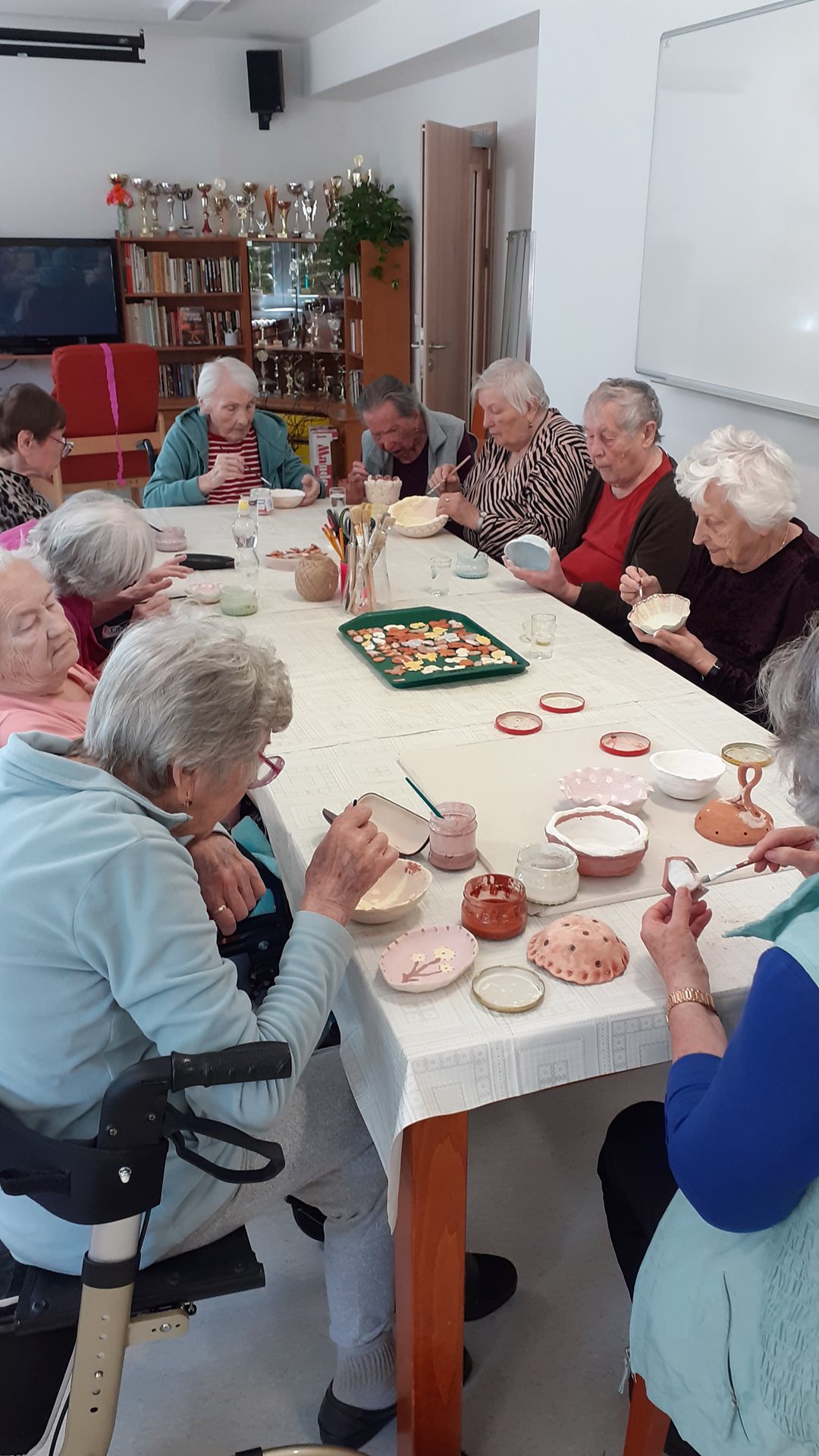 Keramické misky nám vyschly, byly vypáleny v keramické peci, a tak pouze čekaly na šikovné ruce našich uživatelů, kteří jim dají barevný kabátek. Uživatelé byli při barvení kreativní, na několika miskách udělali vzor. Teď budeme s uživateli čekat, než se misky znovu vypálí. Všichni se těšíme na výsledek.