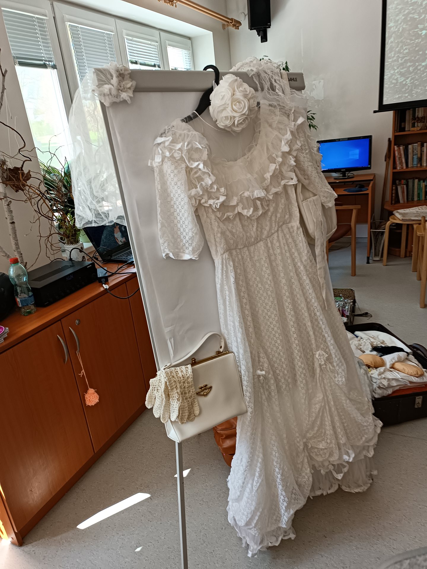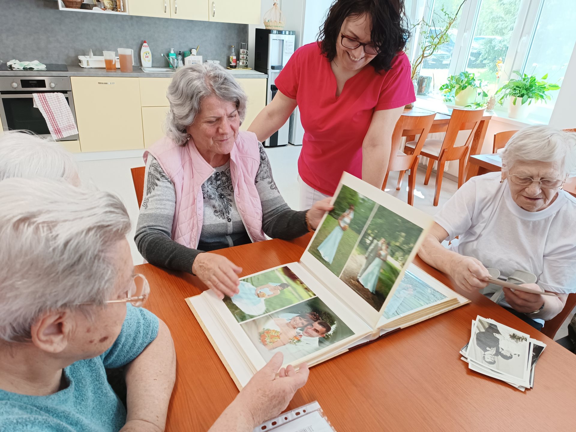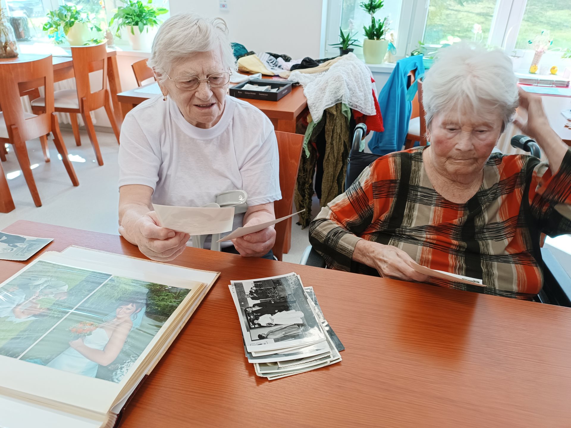 Tématem dnešního odpoledne bylo Svatební šaty dřívější doby. Uživatelky donesli své svatební fotografie. Společně si je prohlíželi a předávali si své zážitky z vlastní svatby. Aktivizační pracovnice Daniela přinesla na ukázku vlastní svatební šaty.
