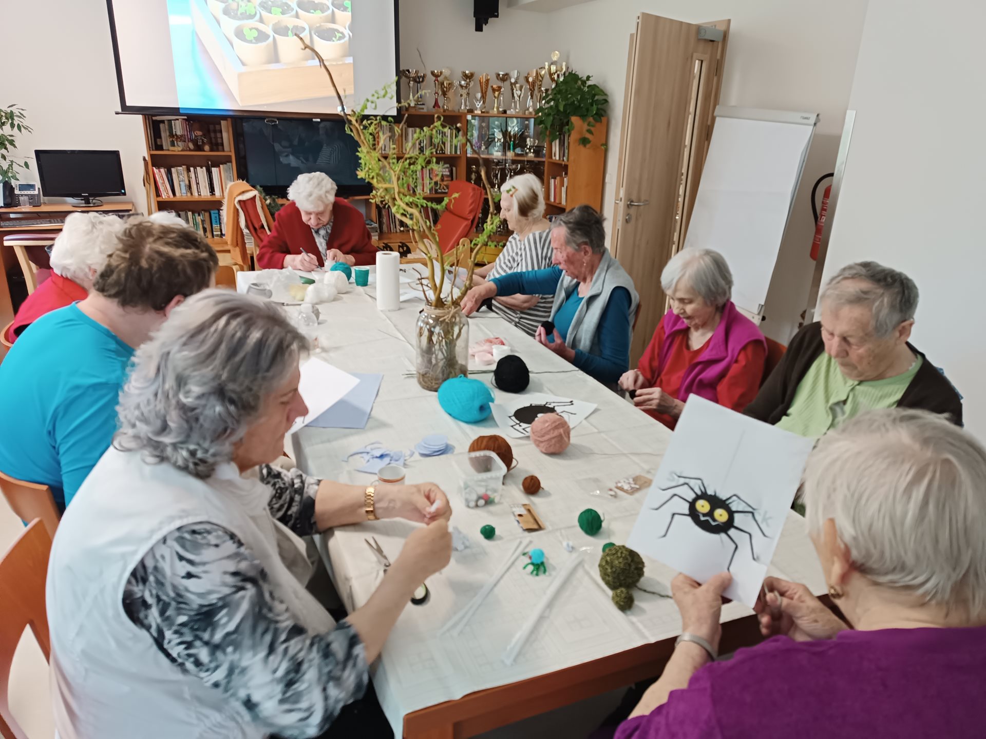 S uživateli jsme připravovali jarní dekorace, ale také jsme tvořili dekorace na plánovanou akci Slet čarodějnic. Uživatelé vyrobili malé pavoučky na stůl.