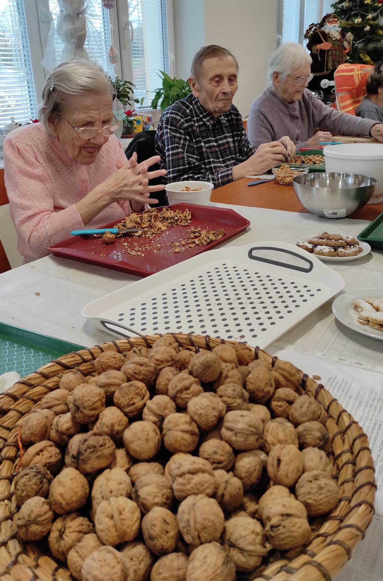Uvolněnou a příjemně naladěnou atmosféru mezi svátky jsme vyplnily oblíbenou aktivitou v rámci ergoterapie – louskání ořechů. Senioři si mezi sebou povídali zážitky z Vánoc, o rodinách a vnoučatech, a přitom vybírali jádra ořechů, je to pro ně známé, neboť většina z nich louskala ořechy doma. Ořechy jsme uskladnily a využijeme je např. při dalším pečení.