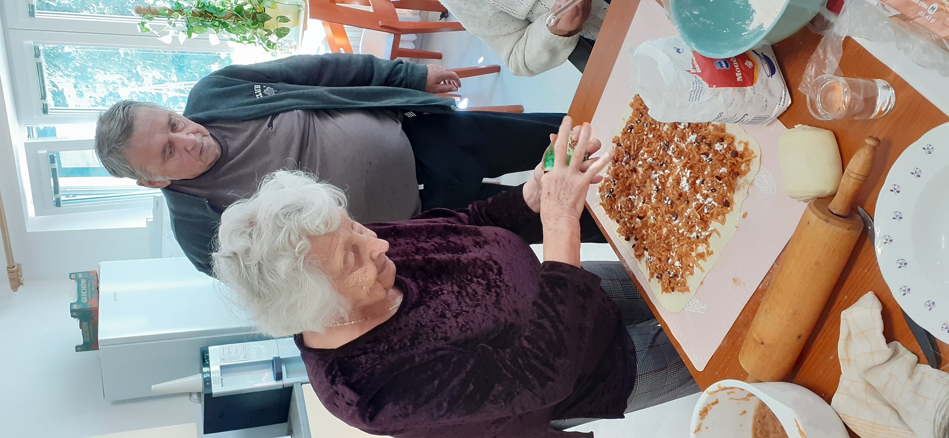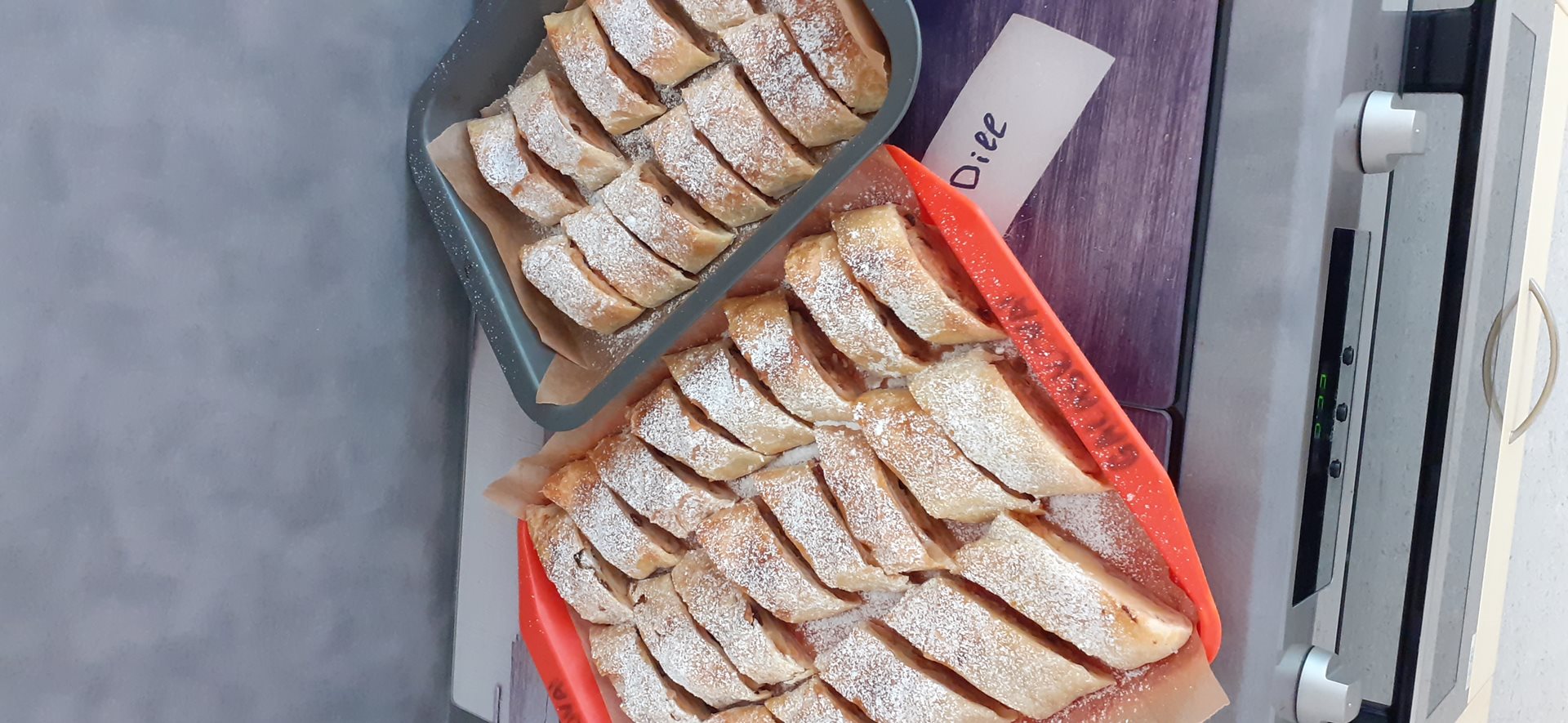 O dnešní pečení jablečného závinu byl značný zájem. Uživatelky měli rozděleny jednotlivé činnosti. Okrajovaly a strouhaly jablka, strouhaly rohlíky na strouhanku, vyvalovaly těsto, vyšlehávaly vajíčko, chystaly mouku, cukr, skořici a rozinky. Všechny byly velmi pracovité a ručně zdatné. Povídaly jsme si, jaké další štrúdly lze udělat a co lze s jablky ještě upéct. Upekly jsme společně 10 štrúdlů, které jsem po vychladnutí uživatelům rozdělily. Všem moc chutnalo.