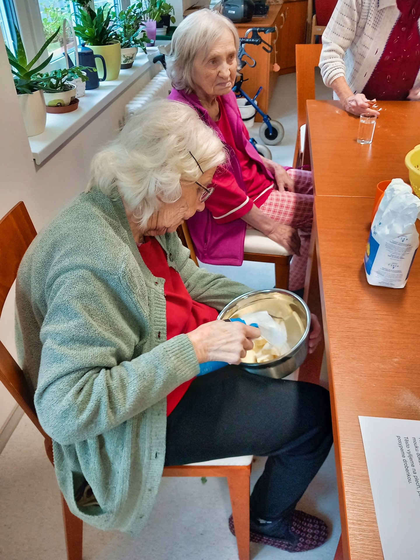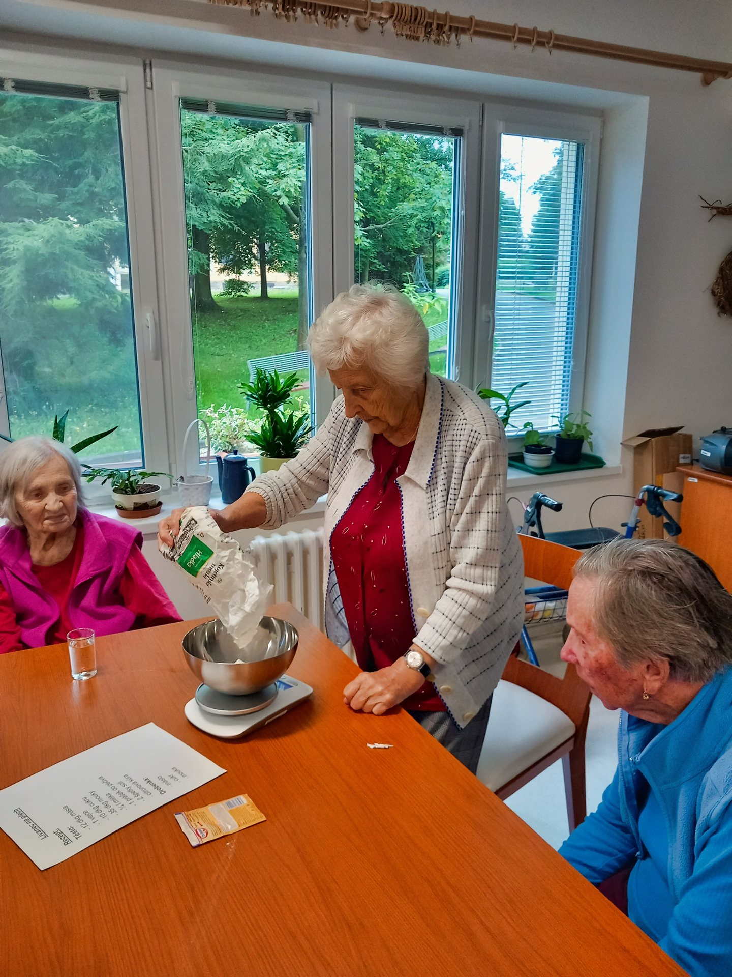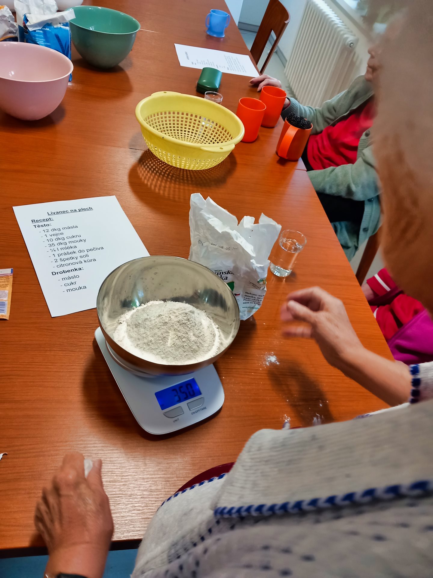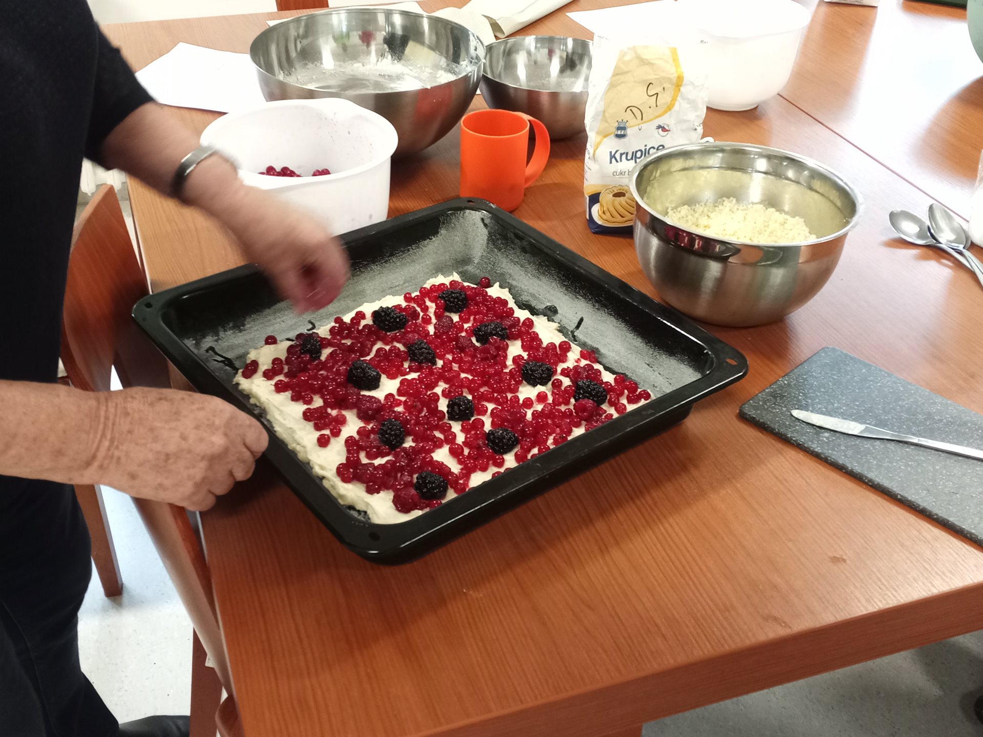 Dnes jsme s uživatelkami pekli lívanec na plech. Těsto uživatelky ozdobily ostružinami, rybízem a posypaly drobenkou. Práce se náležitě rozdělily. Lívanec si po ochutnání pochválily.