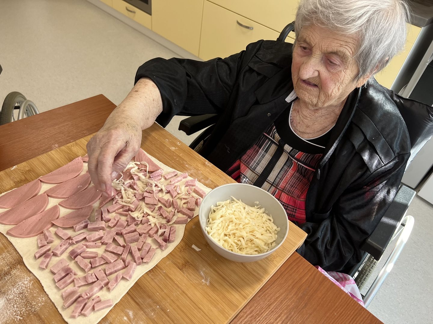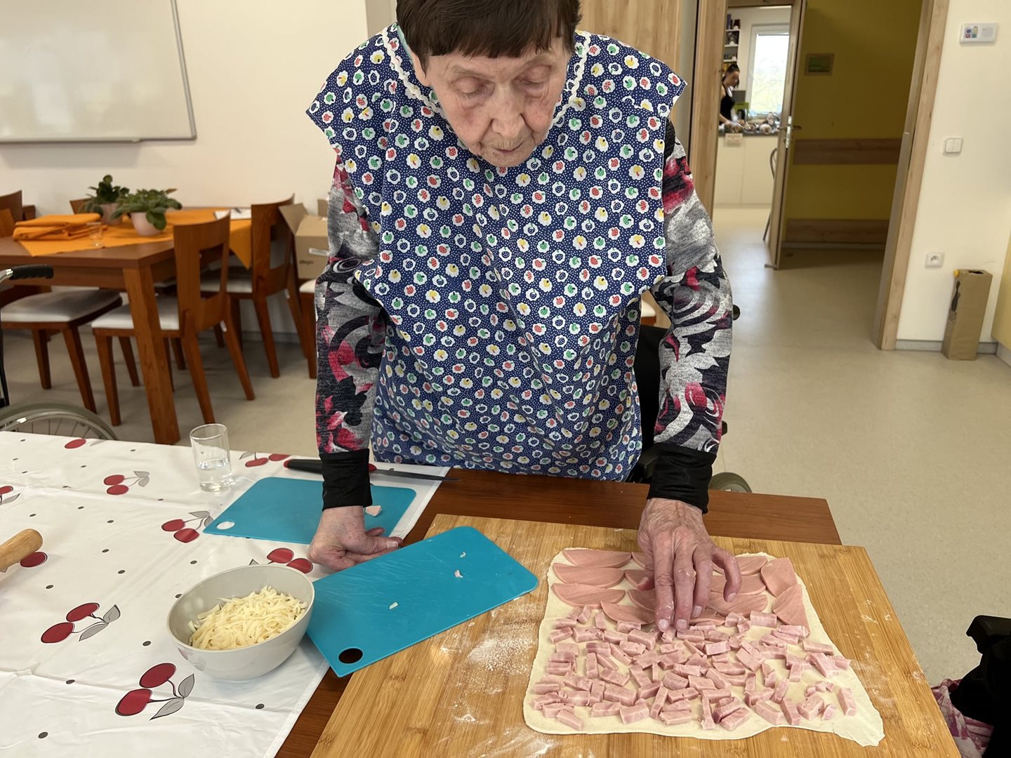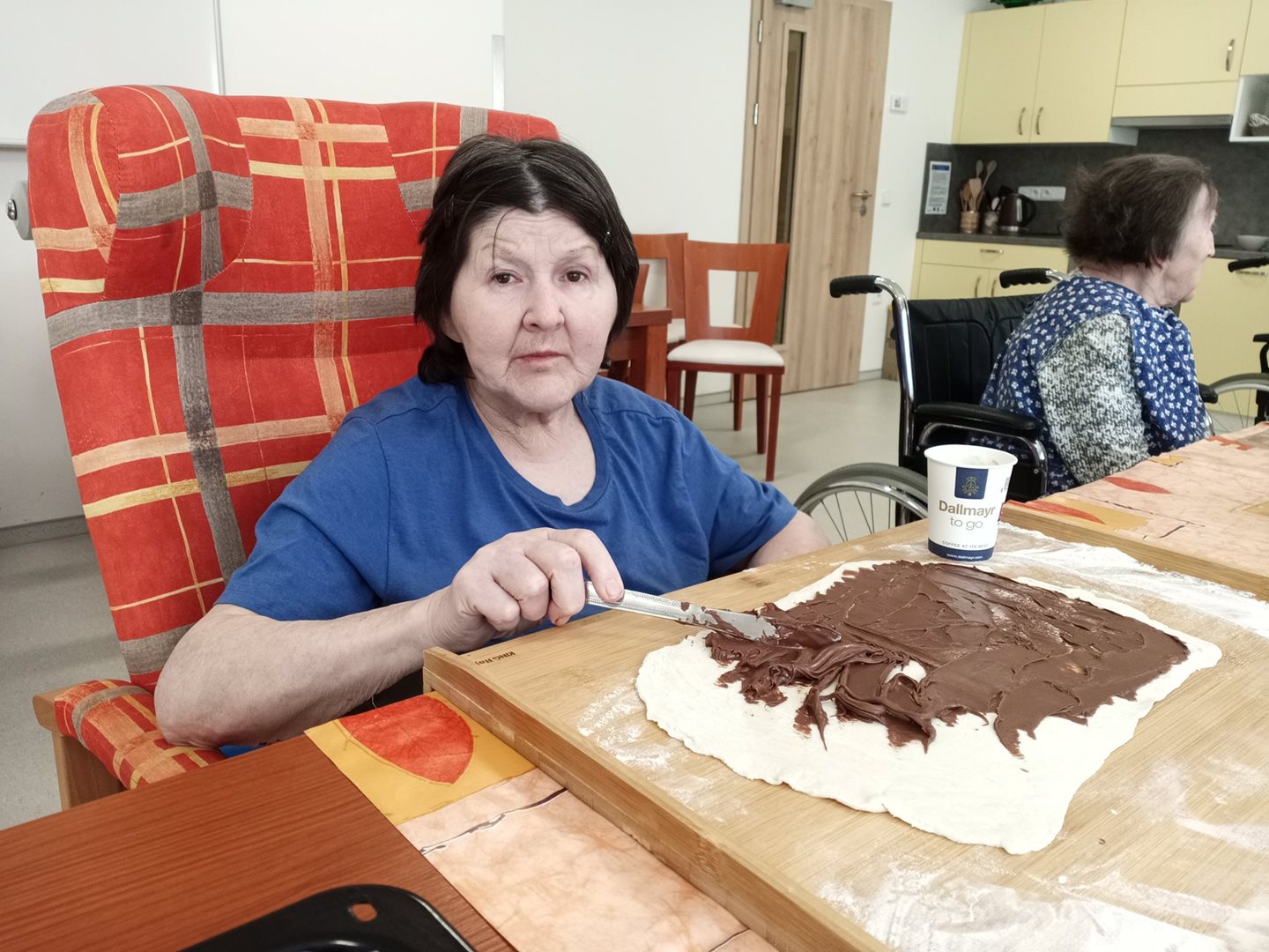 Dopoledne jsme s uživateli pekli sladkou a slanou variantu z listového těsta. Sladká varianta byla tvarohovo-povidlové šátečky a jako slanou variantu jsme upekli šunkovo-sýrové šneky a plněné rohlíčky se sezamem. Obě varianty se vydařily a uživatelé byli nadšeni z úspěchu. Vzpomínali, že z listového těsta pekly především štrúdl. Hotové výrobky rozdáme po vychladnutí uživatelům.