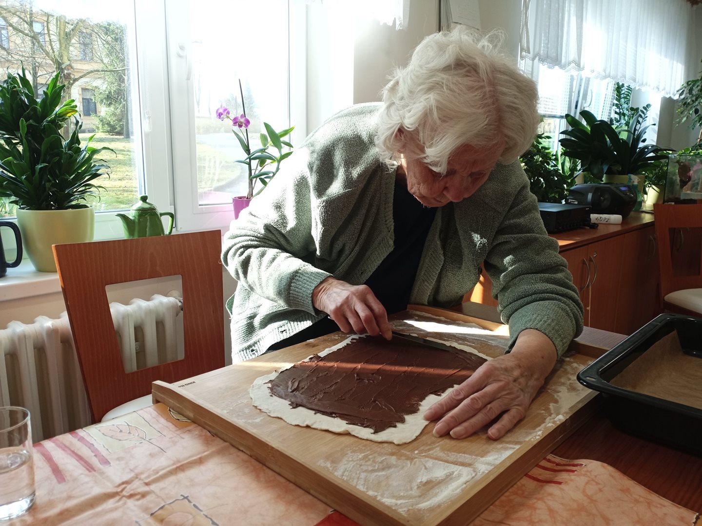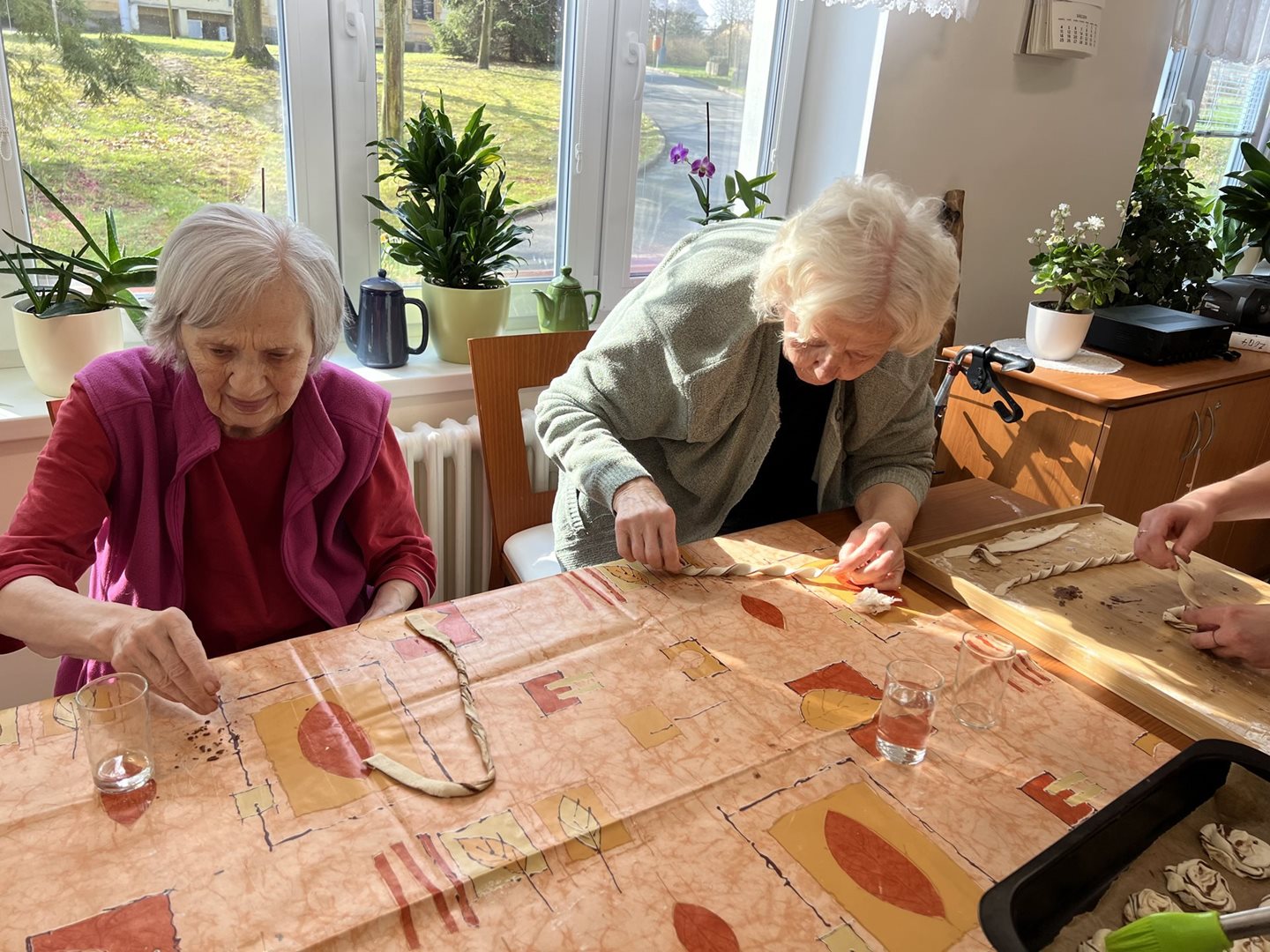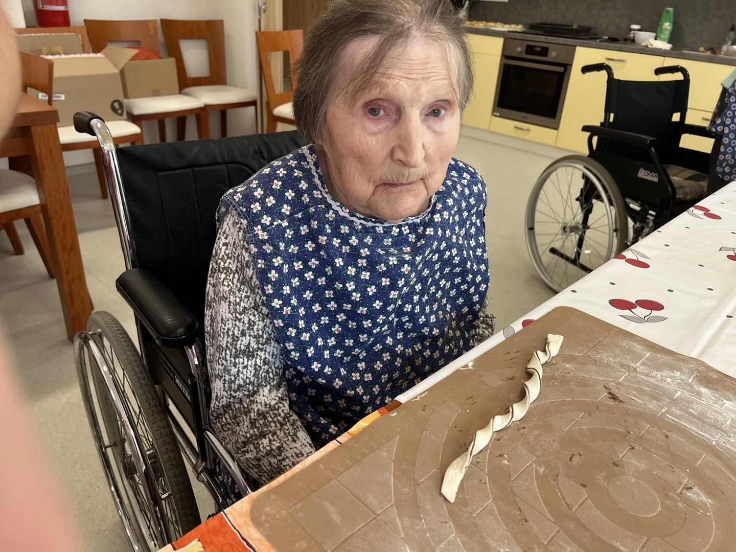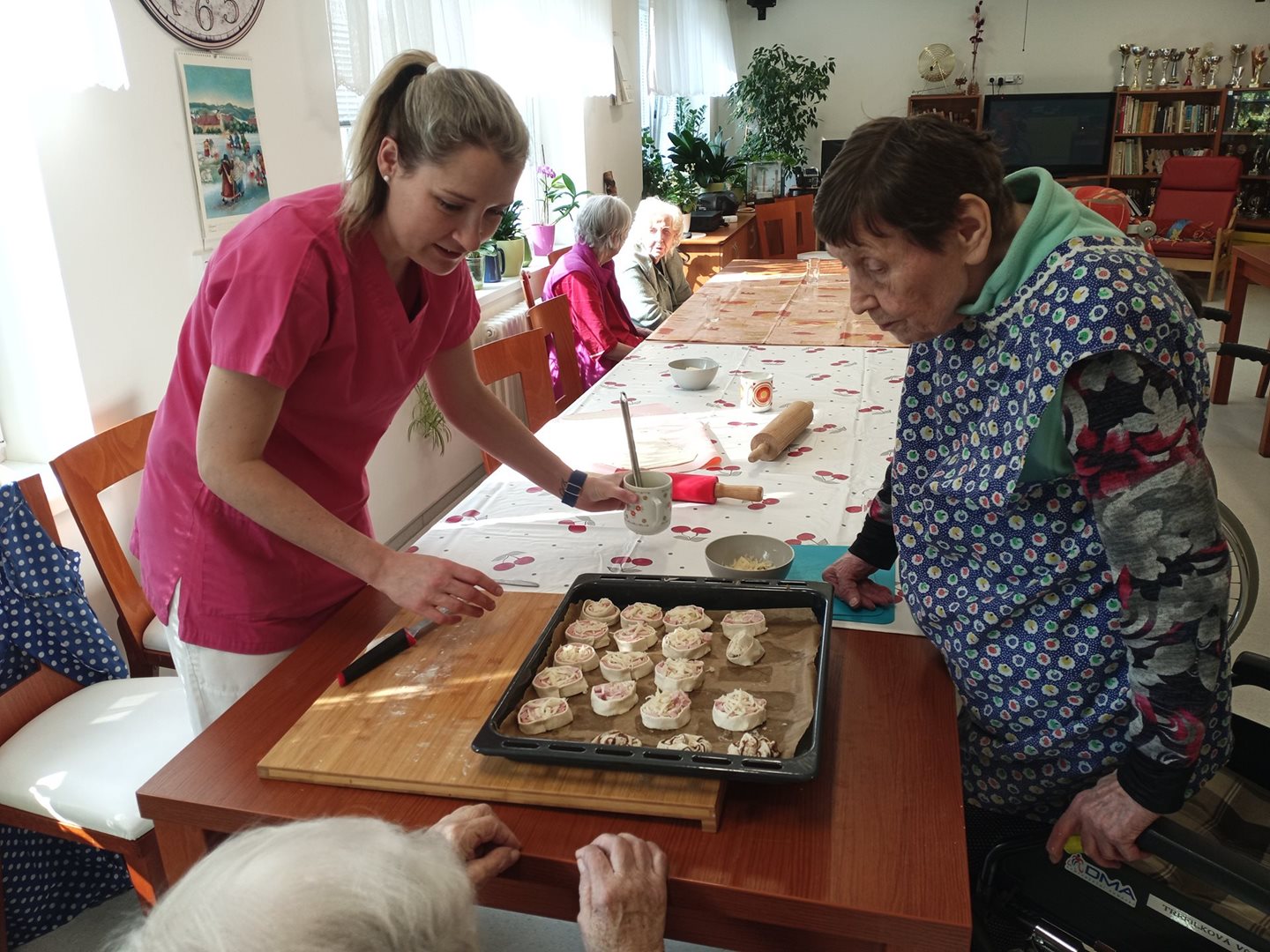 Dopoledne jsme s uživateli pekli sladkou a slanou variantu z listového těsta. Sladká varianta byla tvarohovo-povidlové šátečky a jako slanou variantu jsme upekli šunkovo-sýrové šneky a plněné rohlíčky se sezamem. Obě varianty se vydařily a uživatelé byli nadšeni z úspěchu. Vzpomínali, že z listového těsta pekly především štrúdl. Hotové výrobky rozdáme po vychladnutí uživatelům.