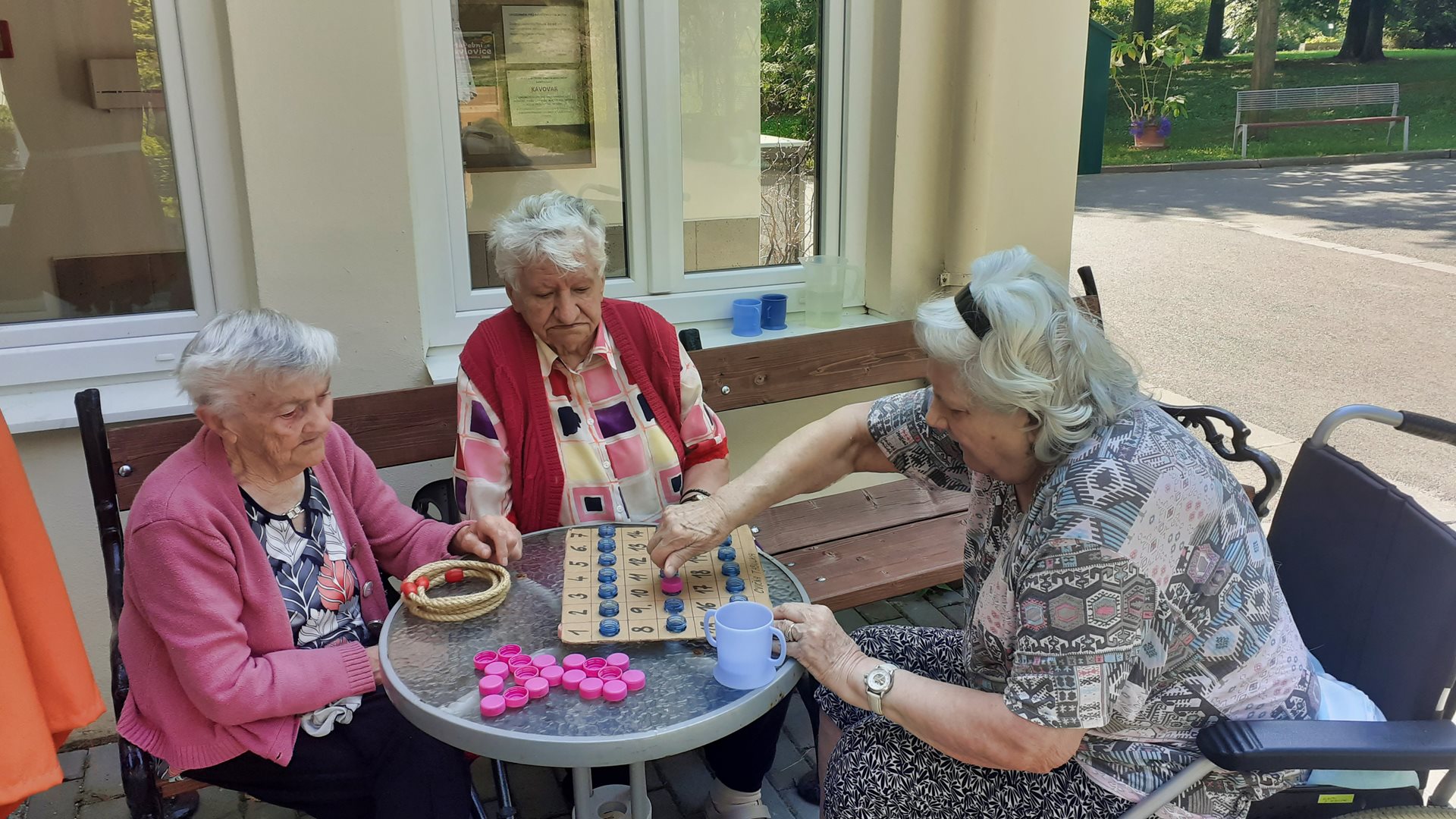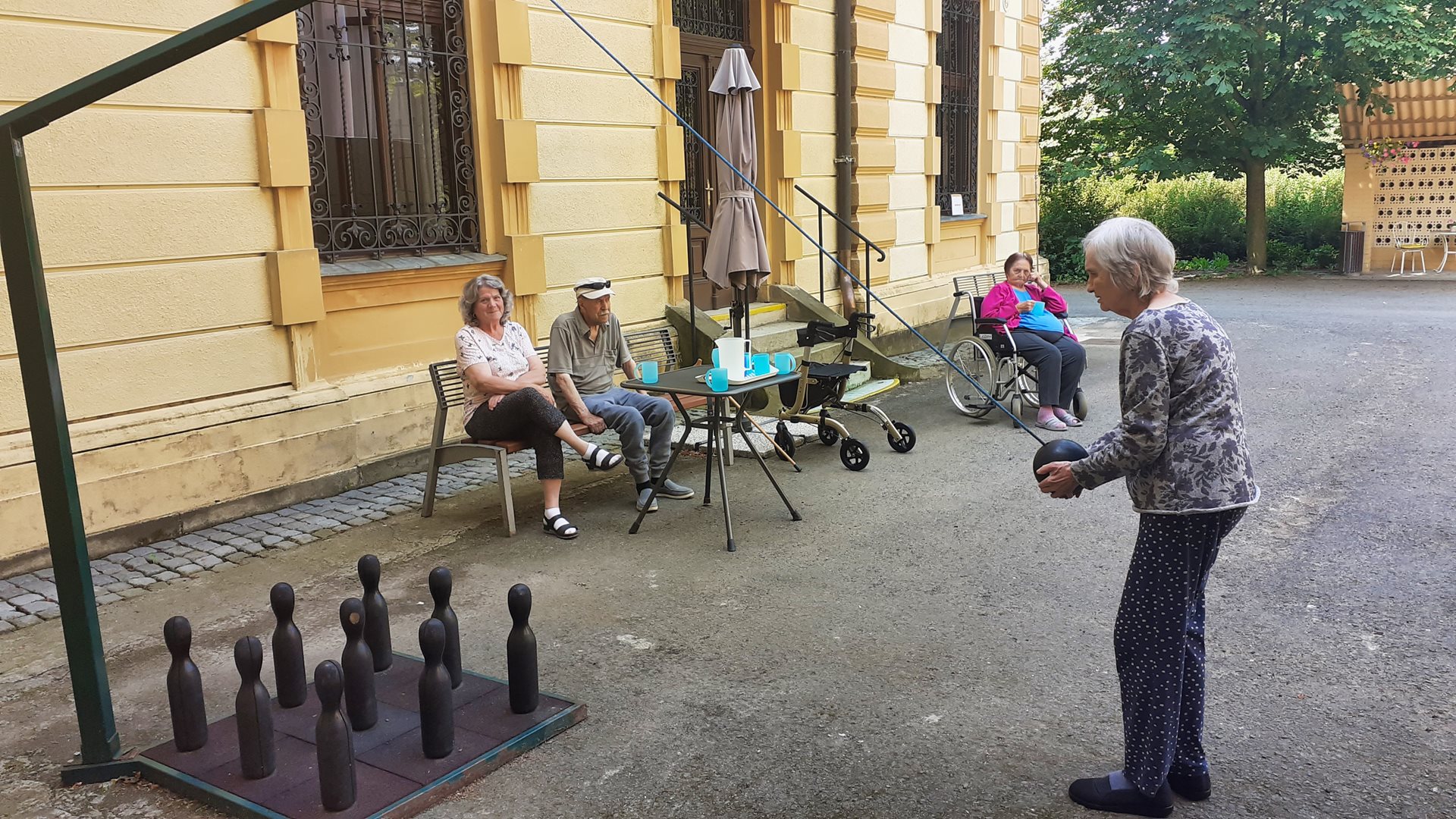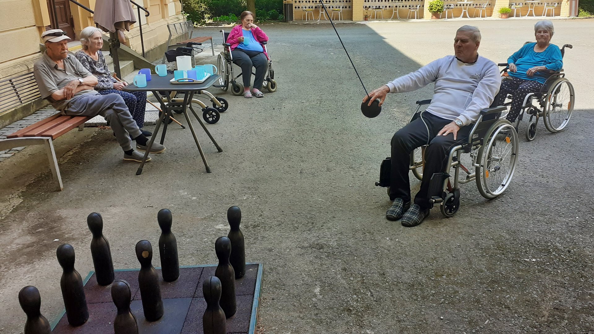 Dnešní dopoledne bylo nabité sportovními aktivitami. Rozdělili jsme se na skupinky, kdy jedna skupinka trénovala na turnaj v Petanque, druhá skupinka hrála ruské kuželky a třetí skupinka trénovala postřeh, paměť a jemnou motoriku.