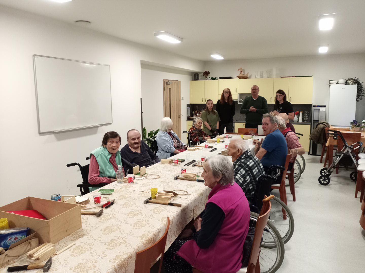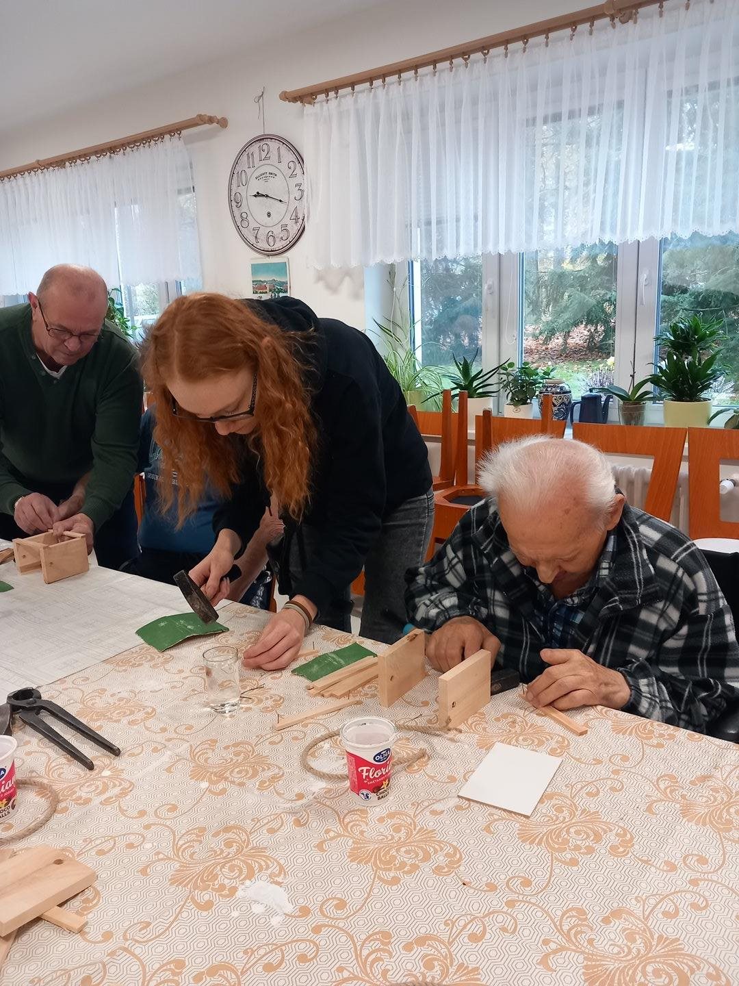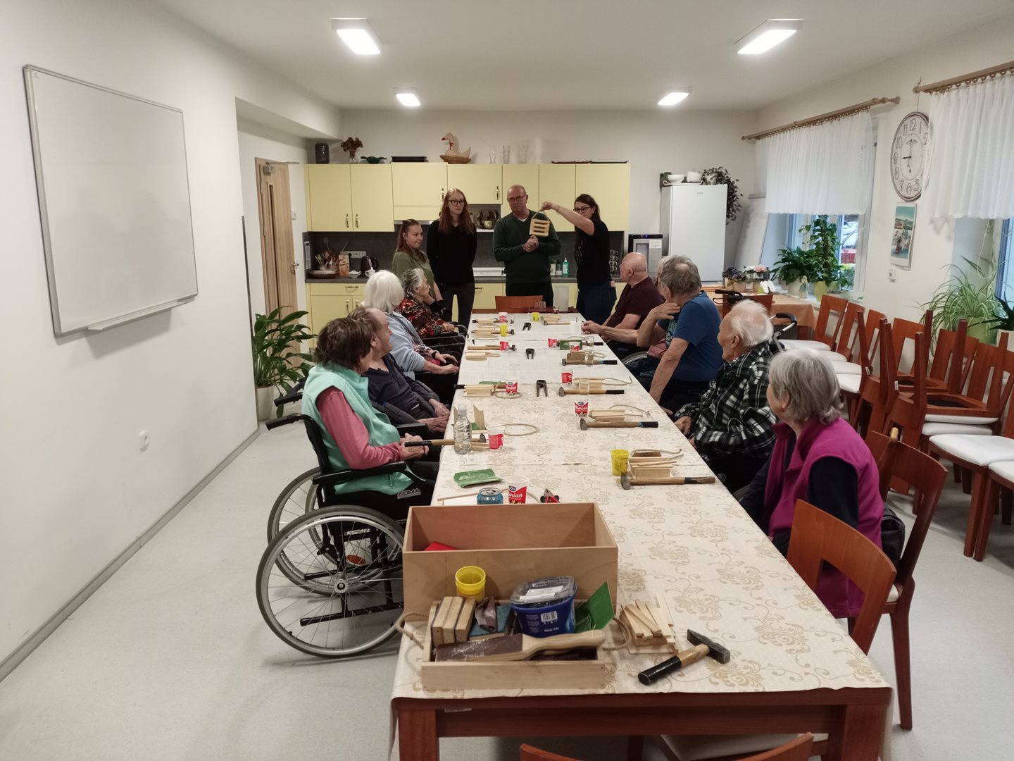 V rámci spolupráce se SŘŠ Tovačov nás navštívili mistři a studentky ze SŘŠ Tovačov a ukázali uživatelům, jak si vyrobit příborník. Uživatelé se ujali práce, vše jim šlo krásně od ruky. Výrobky se všem moc povedli a jako odměnu si je mohli ponechat.