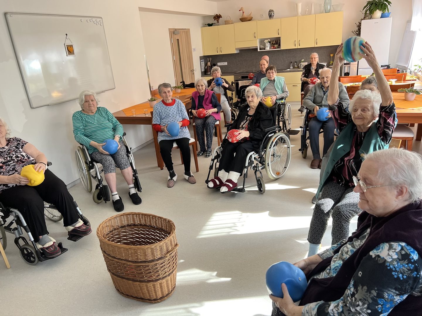 Dnes jsme s uživateli ve skupince procvičovali jemnou motoriku prstů. Prováděli jsme simulaci pohybu při míchání, kořenění- špetka aj.