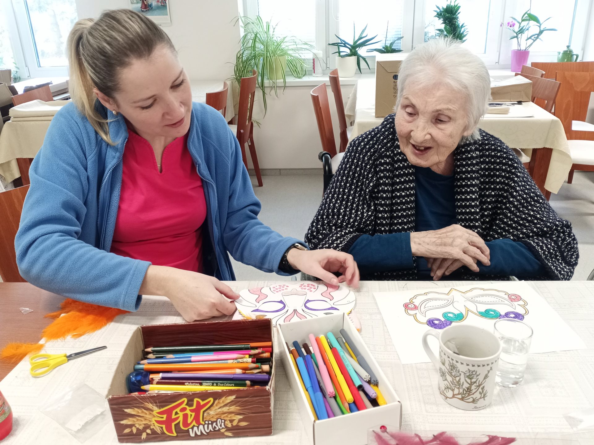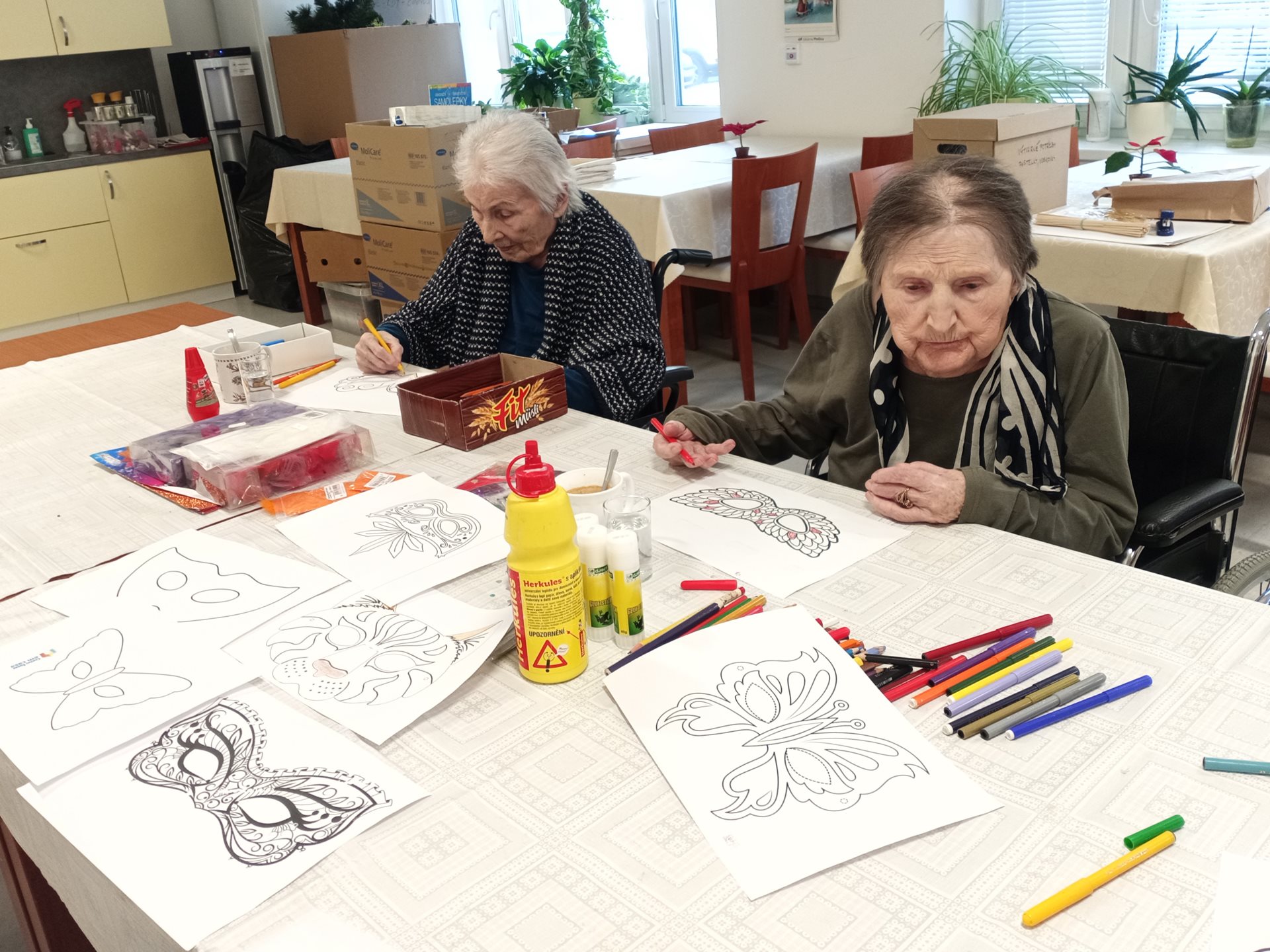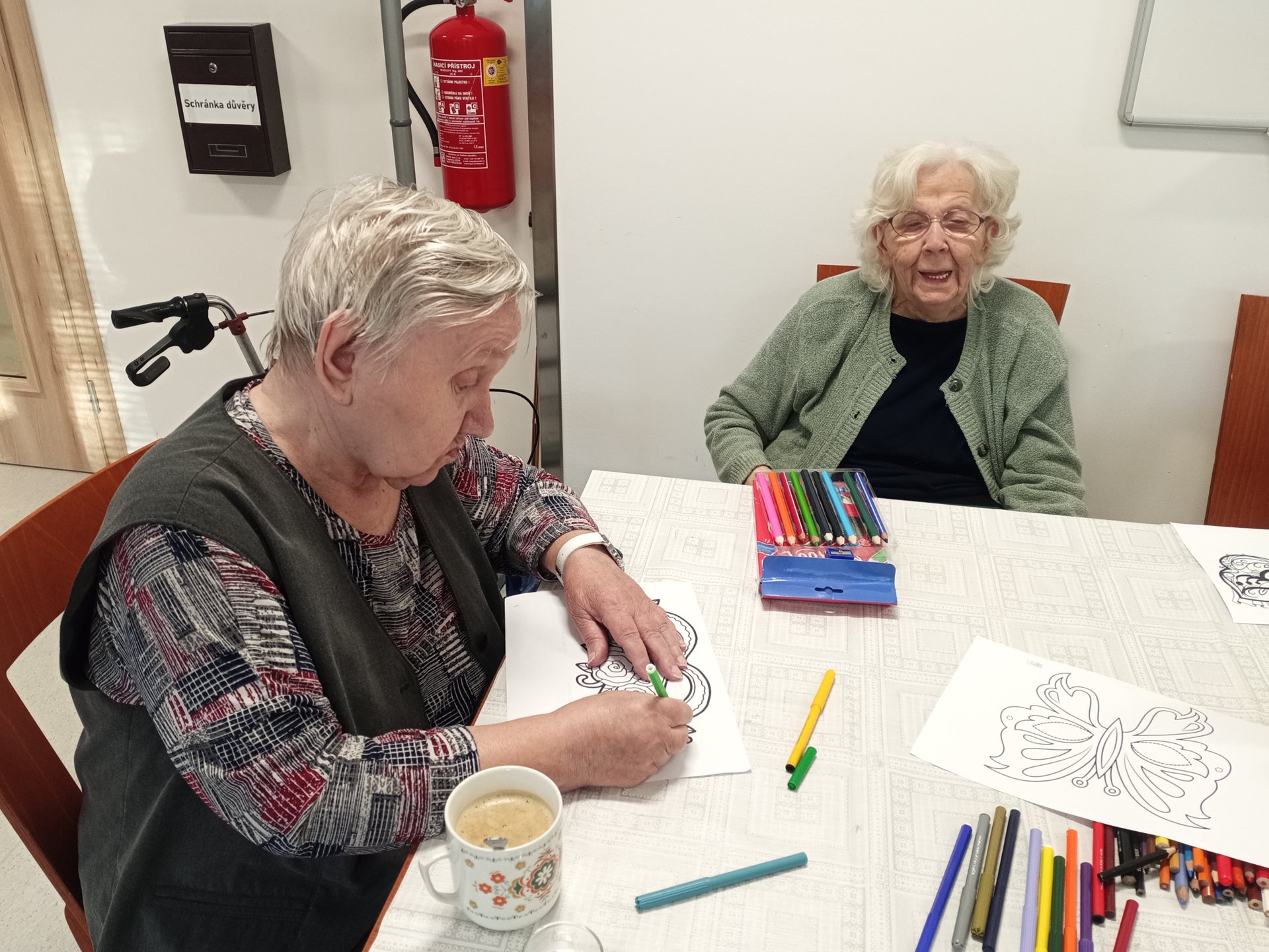 Uživatelé si vybrali z vytisknutých škrabošek, následně je barevně vymalovali, dozdobili. Hotové škrabošky jsme vystavili v jídelně na tabuli, aby z nich měli všichni radost.